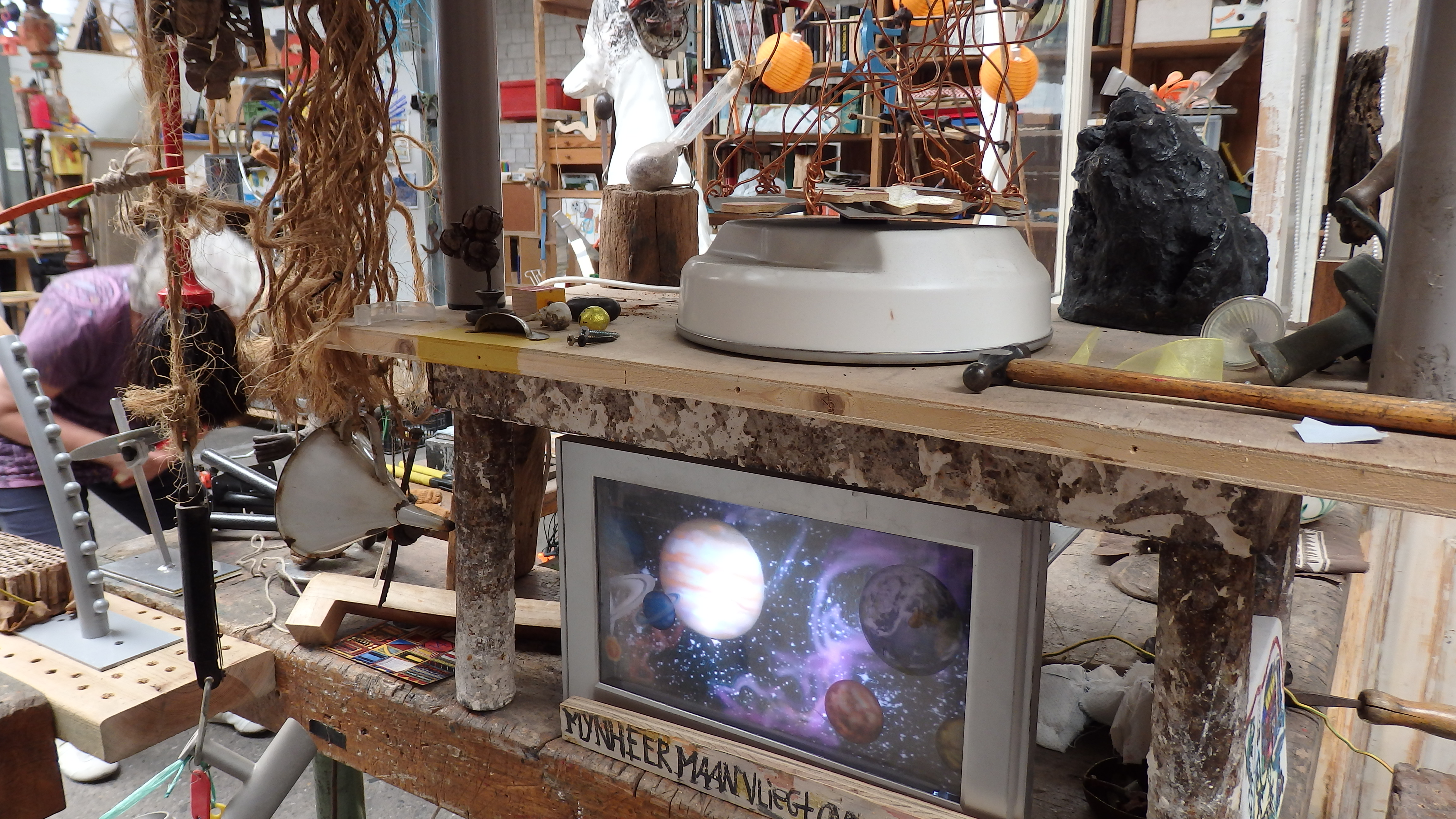 in juni was er een workshop in het atelier van beelden kunstenaar Wim Vonk. Hij maakt grote installaties en machines, die zijn opgebouwd met materialen en voorwerpen die voor Wim Vonk een bijzondere betekenis hebben. Voor hem heeft elk voorwerp een eigen verhaal. Elke installatie zit bomvol verhalen en geschiedenis.