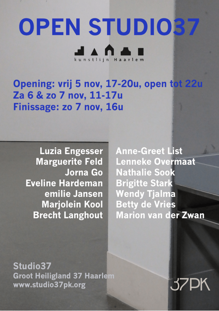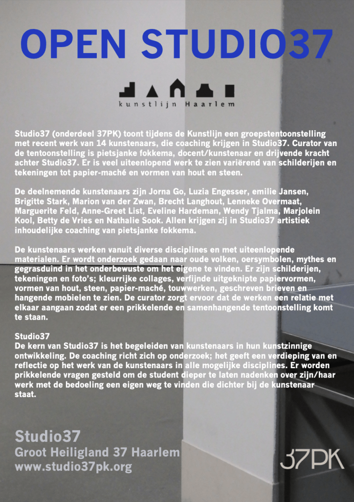 Hierbij de aankondiging van de tentoonstelling in Studio37 tijdens de Haarlemse lente. Vorig jaar heeft de Studio ook meegedaan; toen deden twee studenten van de Rietveld Academie mee. Dit jaar hebben we vier jonge kunstenaars, vorig jaar afgestudeerd aan de Academie in Utrecht, uitgenodigd. Er wordt een verbinding gemaakt met drie jonge deelnemers van de Studio.